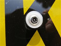 These pics are from a 15 month-old vehicle. Polytop fixing on front plate is badly rust-stained. The Yellow polytop on the rear plate has faded to almost white, and the screw has so badly corroded, the recess ‘rounded’ (or 'cammed') during removal. |